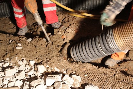 Schnell zur Stelle bei einem Rohrleitungsbruch! Die Saugbagger-Crew übernimmt alle Arbeiten von A wie "absperren" bis Z wie "zuschütten".